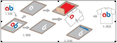 制作流程為,通過刮板的擠壓,使油墨通過圖文部分的網(wǎng)孔轉(zhuǎn)移到衣物上,制作如下圖: